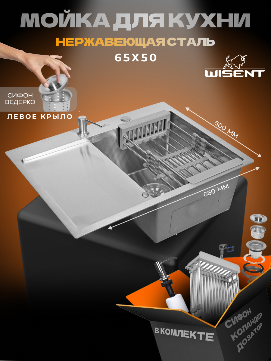 Набор кухонная мойка из нерж. стали WISENT WS36550-L с коланд. W302644, доз. W405A, сиф. W02-114 12 464 ₽