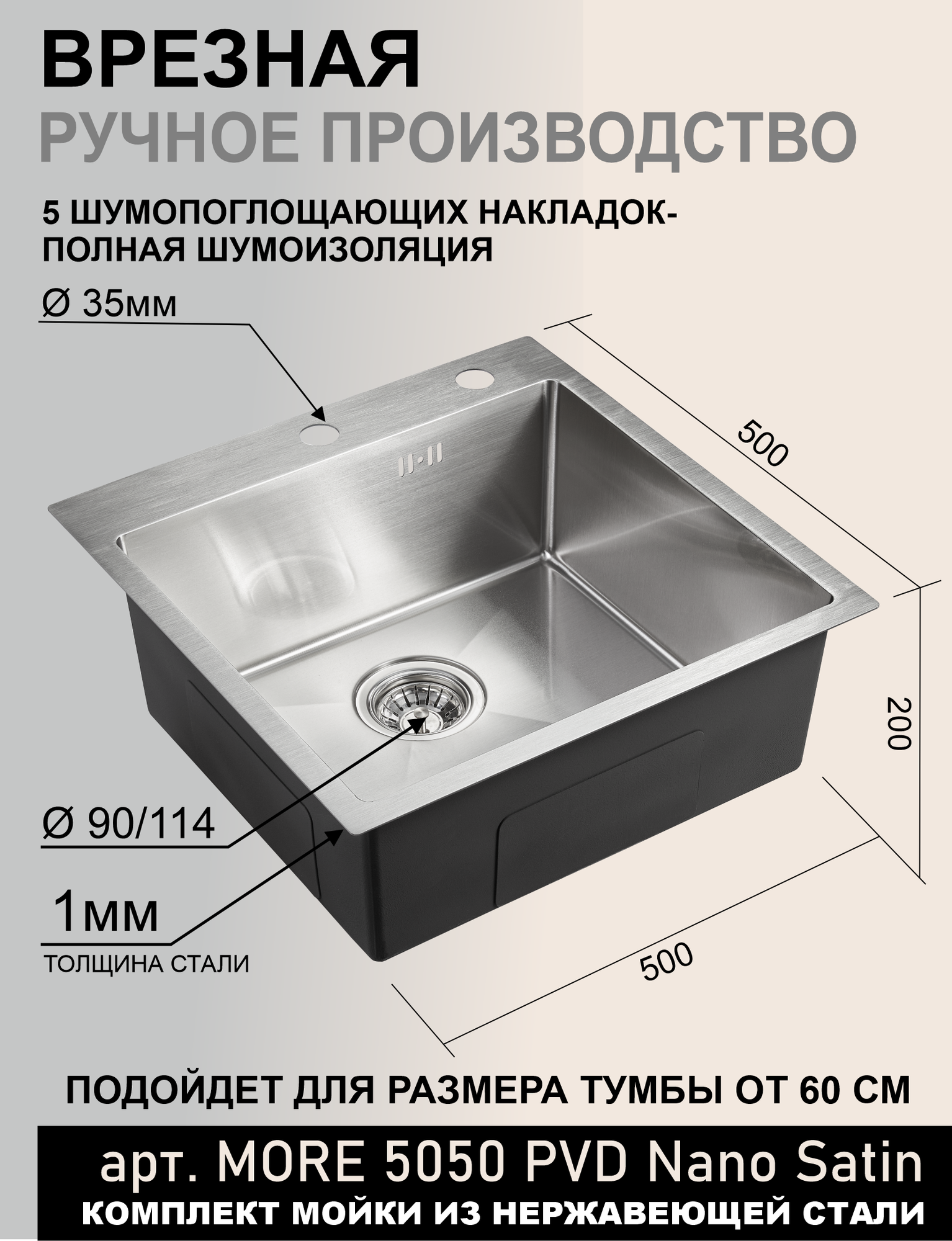 10 цен на Мойка для кухни 50х50 см сатин нержавеющая сталь с PVD покрытием, решетка на дно, ролл матт, дозатор, сифон, перелив
