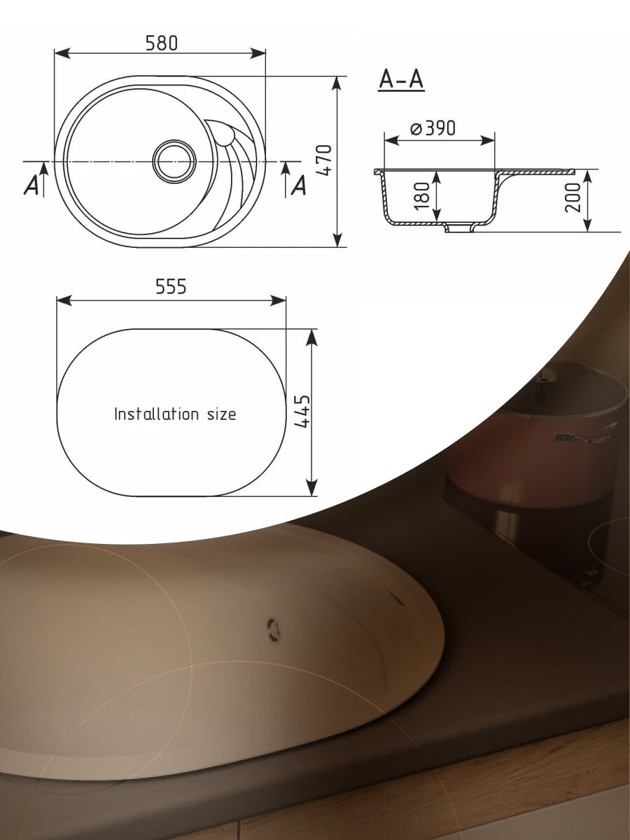 Мойка для кухни оборачиваемая овальная BAU Nimb White snow 58х47, выпуск с сифоном в комплекте, белый снег информация:
