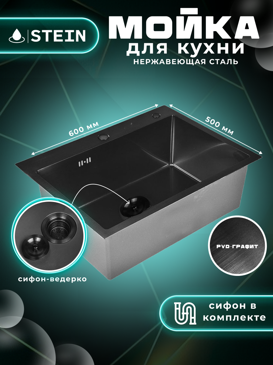 Отзывы на Мойка для кухни STEIN 60х50 из нержавеющей стали, графит с PVD покрытием, с сифоном ведерко ST6050B