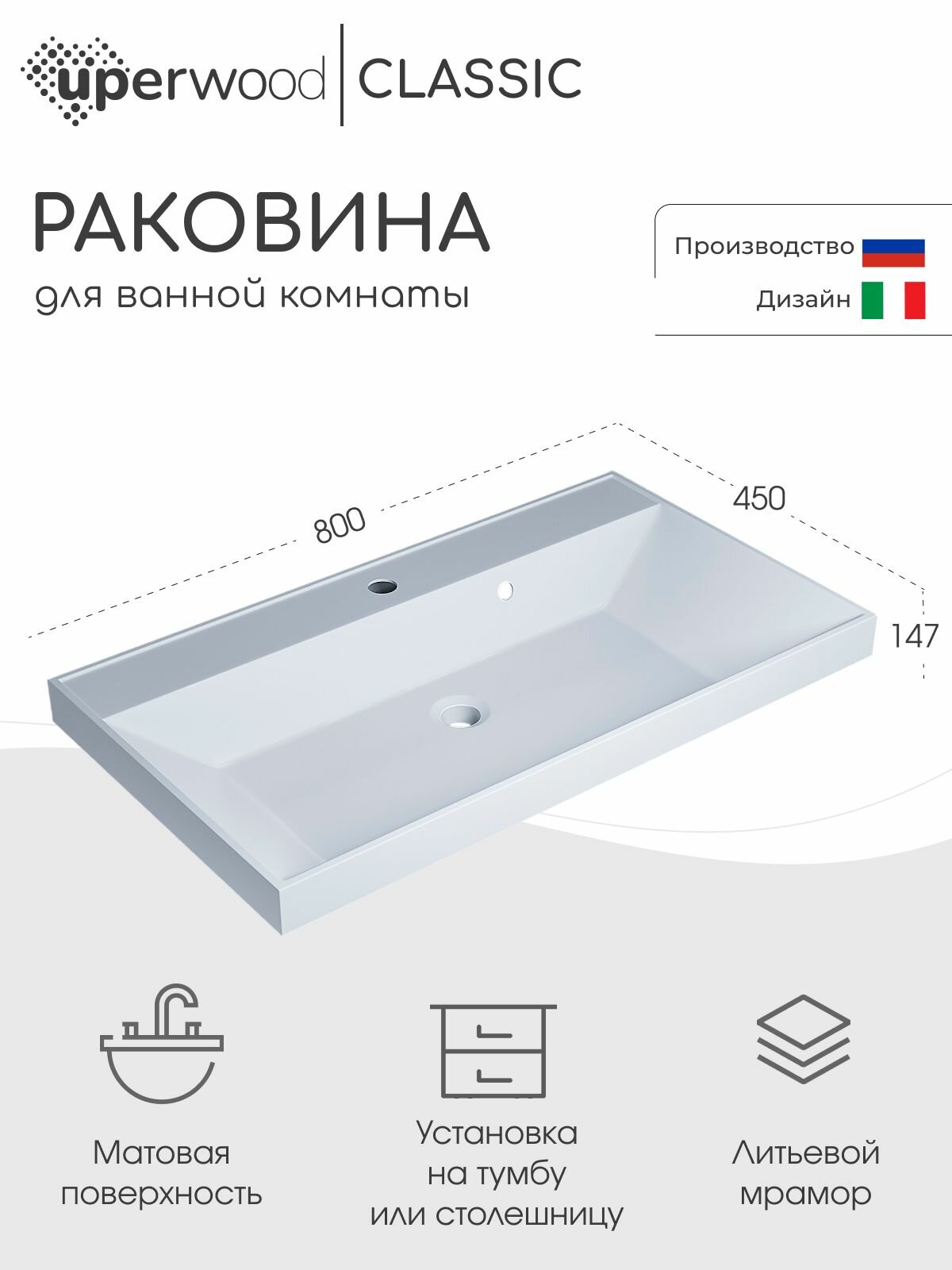 Раковина для ванной Uperwood Classic 80х45х14,5 см, белая матовая информация: