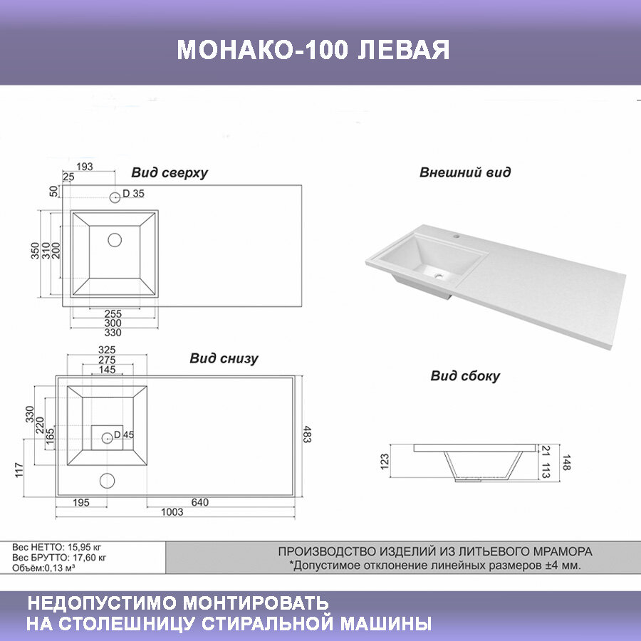 Раковина над стиральной машиной МОНАКО-100 левая с сифоном и кронштейном информация: