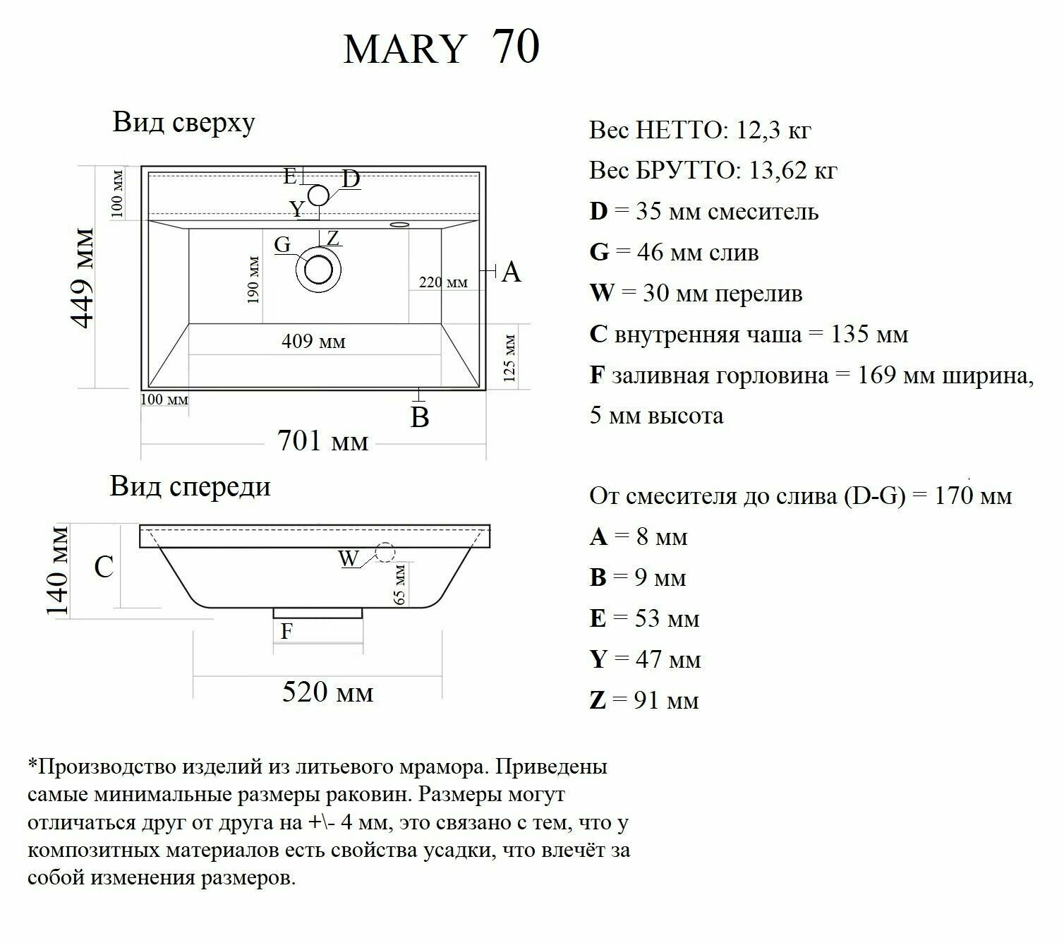 Отзывы на Раковина для ванной комнаты "MARY" 70х45 из литьевого мрамора JOYMY