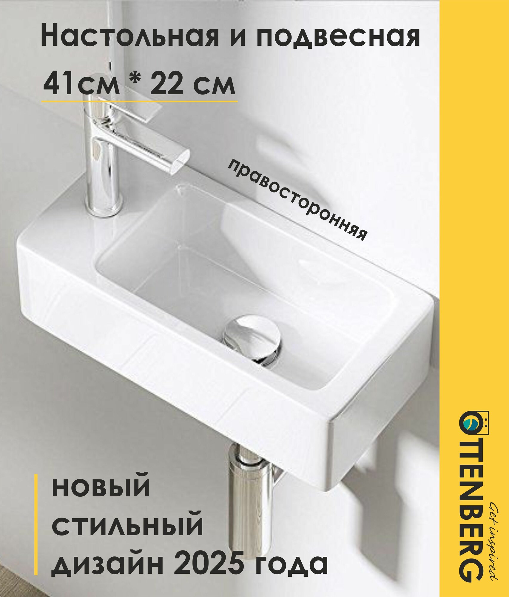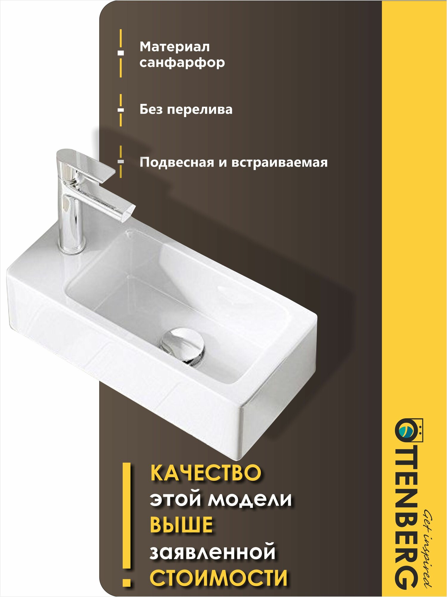 Подвесная мини раковина для туалета правосторонняя белая прямоугольная Ottenberg, 41х22х10см информация: