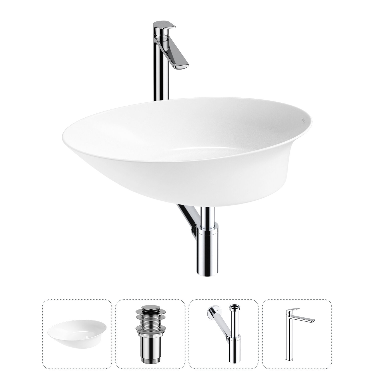 Накладная раковина в ванную комнату Wellsee Faze Moment 20214967R в наборе 4 в 1: раковина 55 см в цвете белый глянец, донный клапан, сифон, смеситель (цвет набора хром) информация: