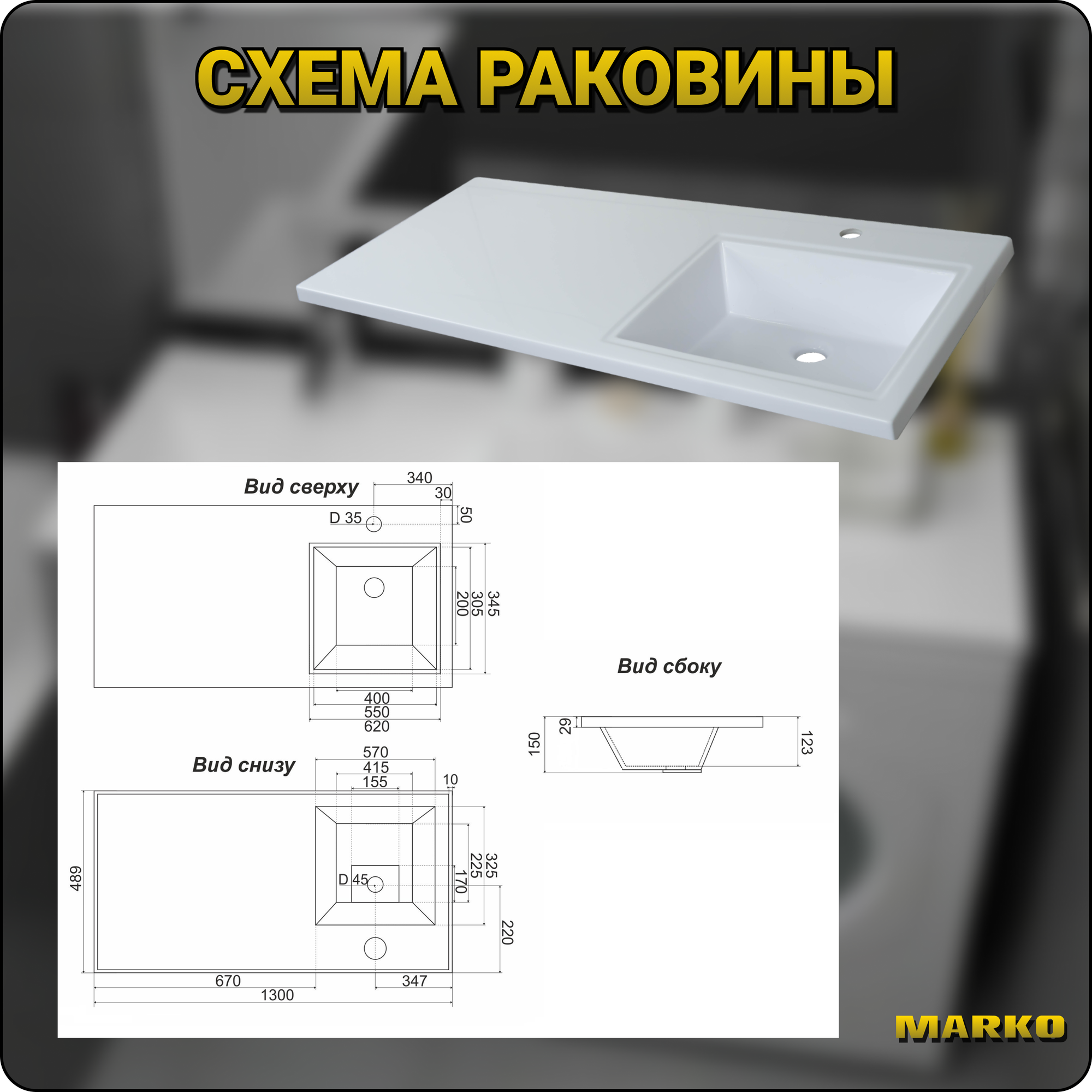 Раковина белая Марсал 130 прав. на стиральную машину 1300*489 информация: