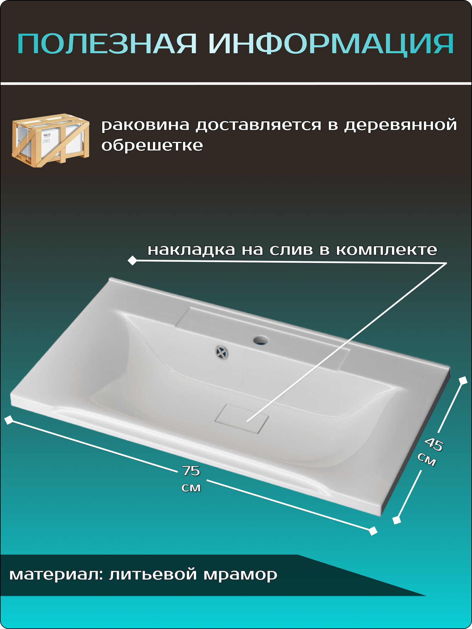Раковина накладная в ванную комнату "Комфорт 75", мебельная, белая информация:
