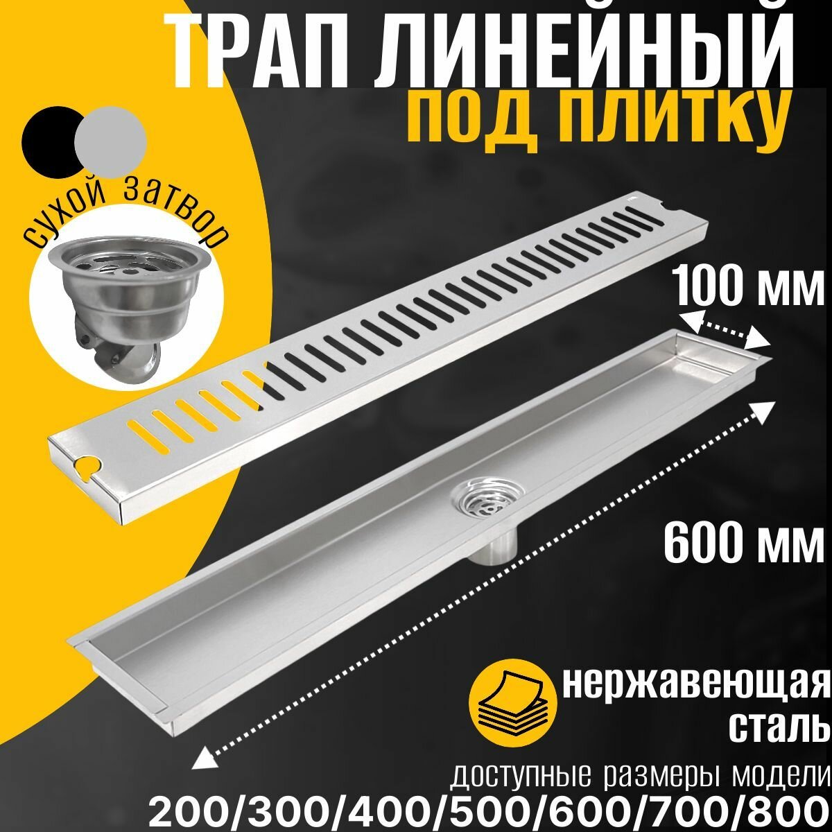 10 цен на Трап линейный хром,600х100мм, душевой лоток с сухим затвором, из нержавеющей стали, с вертикальным выходом и с зазором под плитку