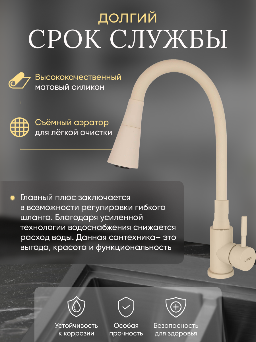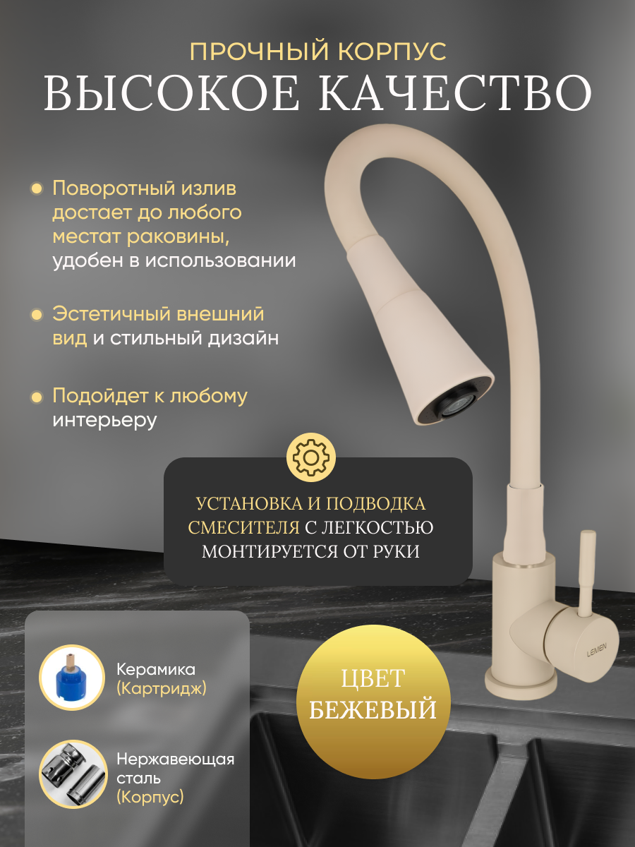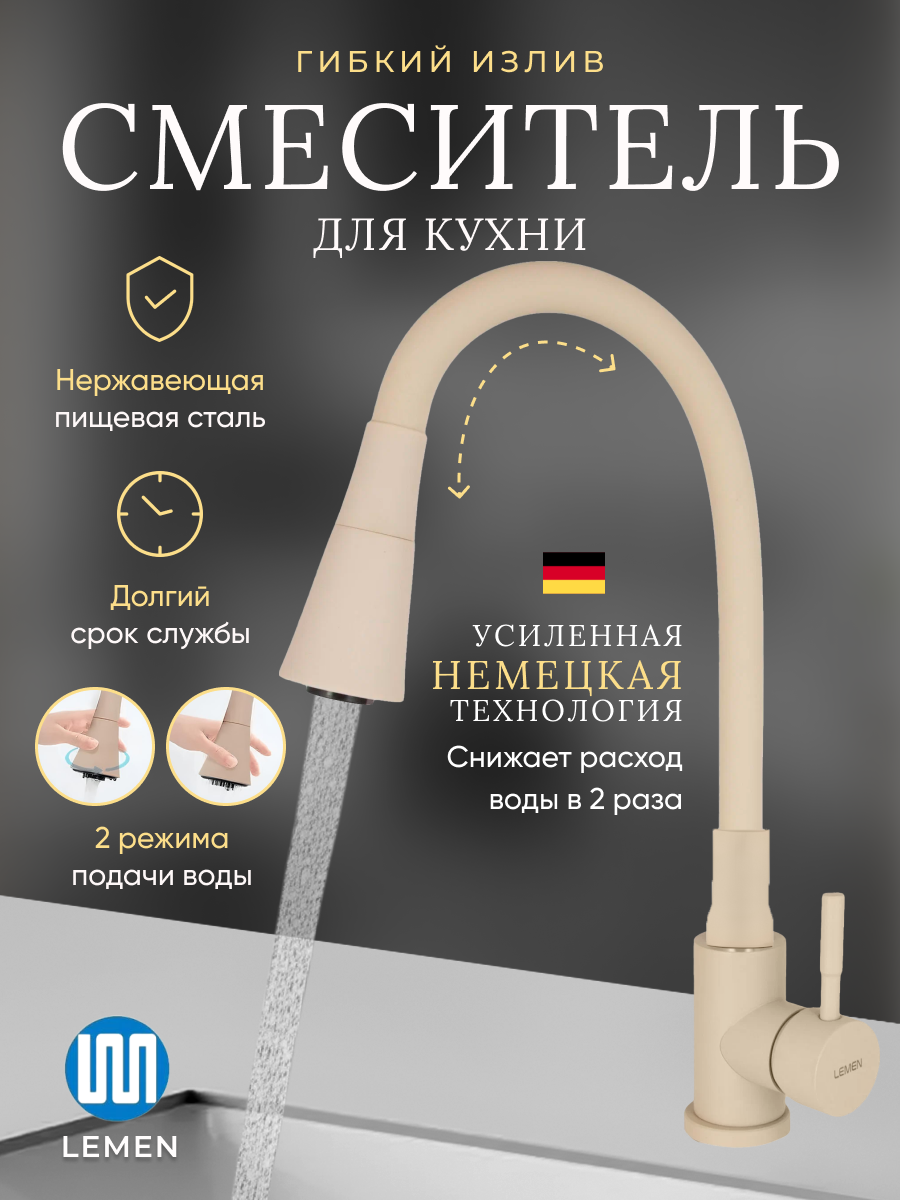 Смеситель для кухни с гибким изливом бежевый Lemen, Кран для мойки и раковины из нержавеющей стали информация: