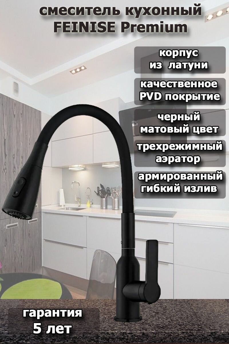 Смеситель для кухни латунный черный YINDAF PREMIUM с гибким изливом и картриджным управлением информация: