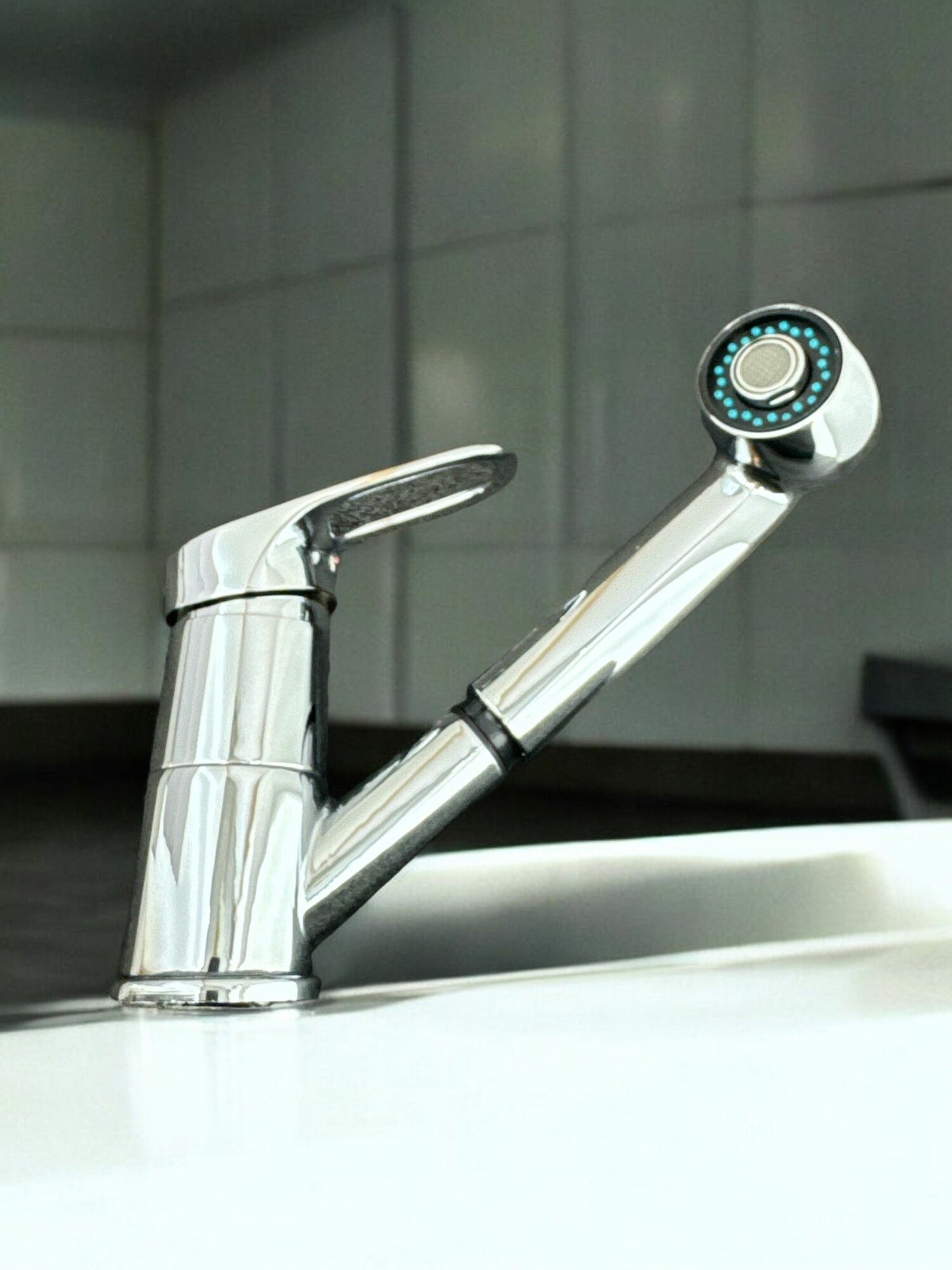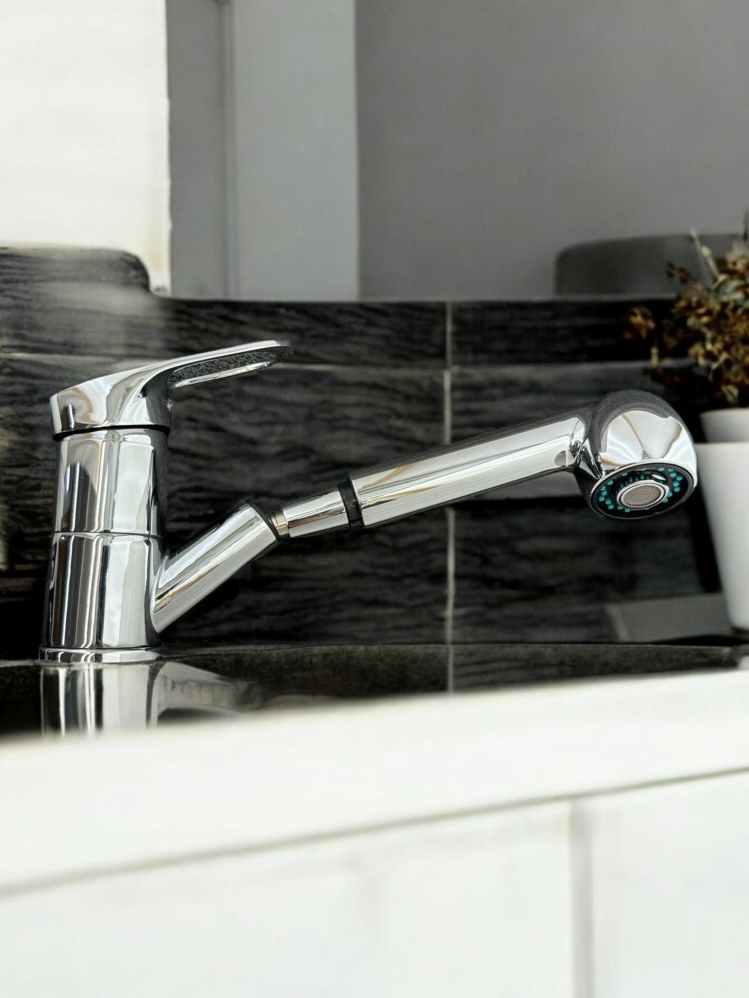 Отзывы на Смеситель для кухни однорычажный с выдвигающейся лейкой. Монтаж на одно отверстие, крепление на шпильке, гибкая подводка 1/2. Цвет хром