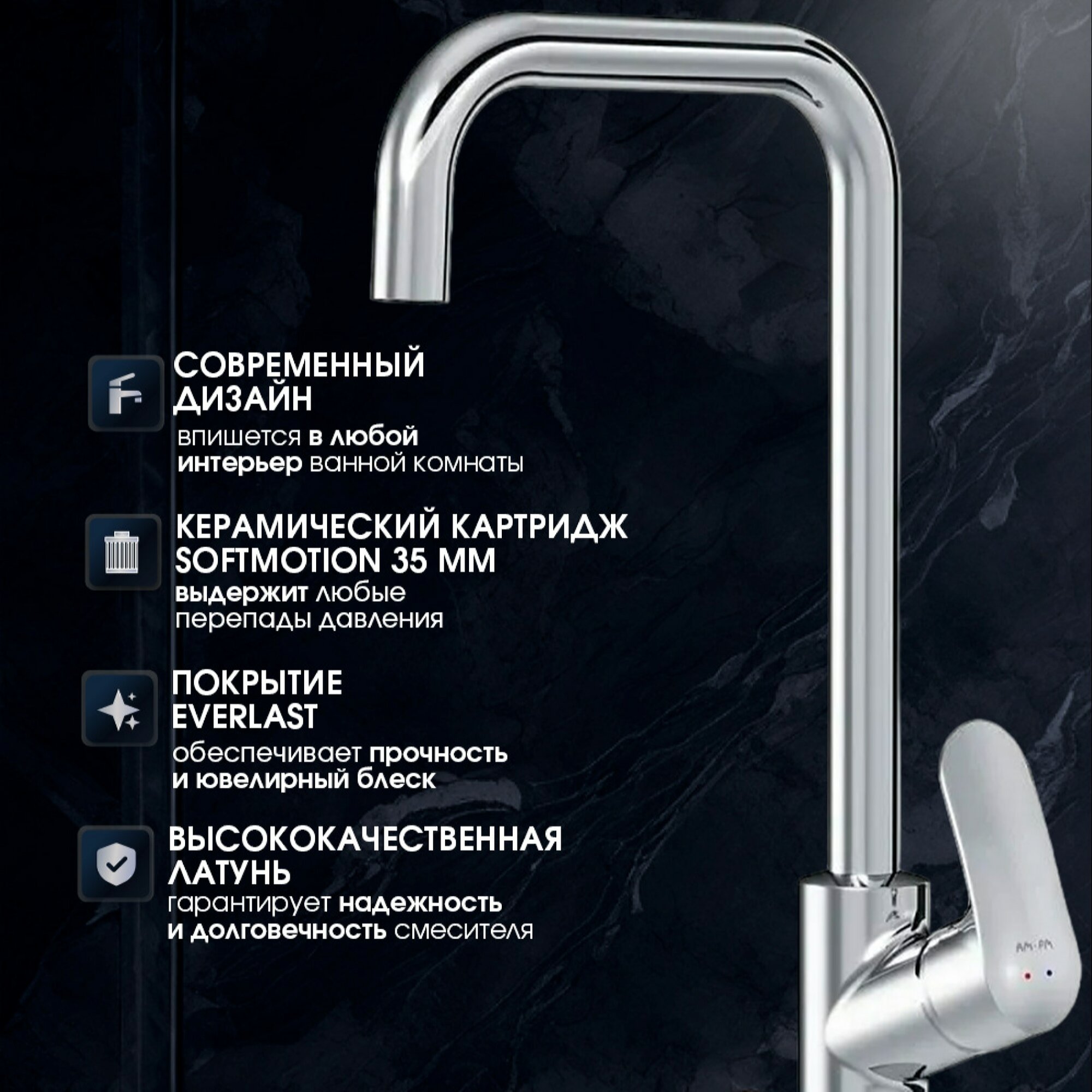 Смеситель для кухни AM.PM Chic хром, G-образный излив, керамический картридж SoftMotion 35 мм, гарантия 10 лет, информация: