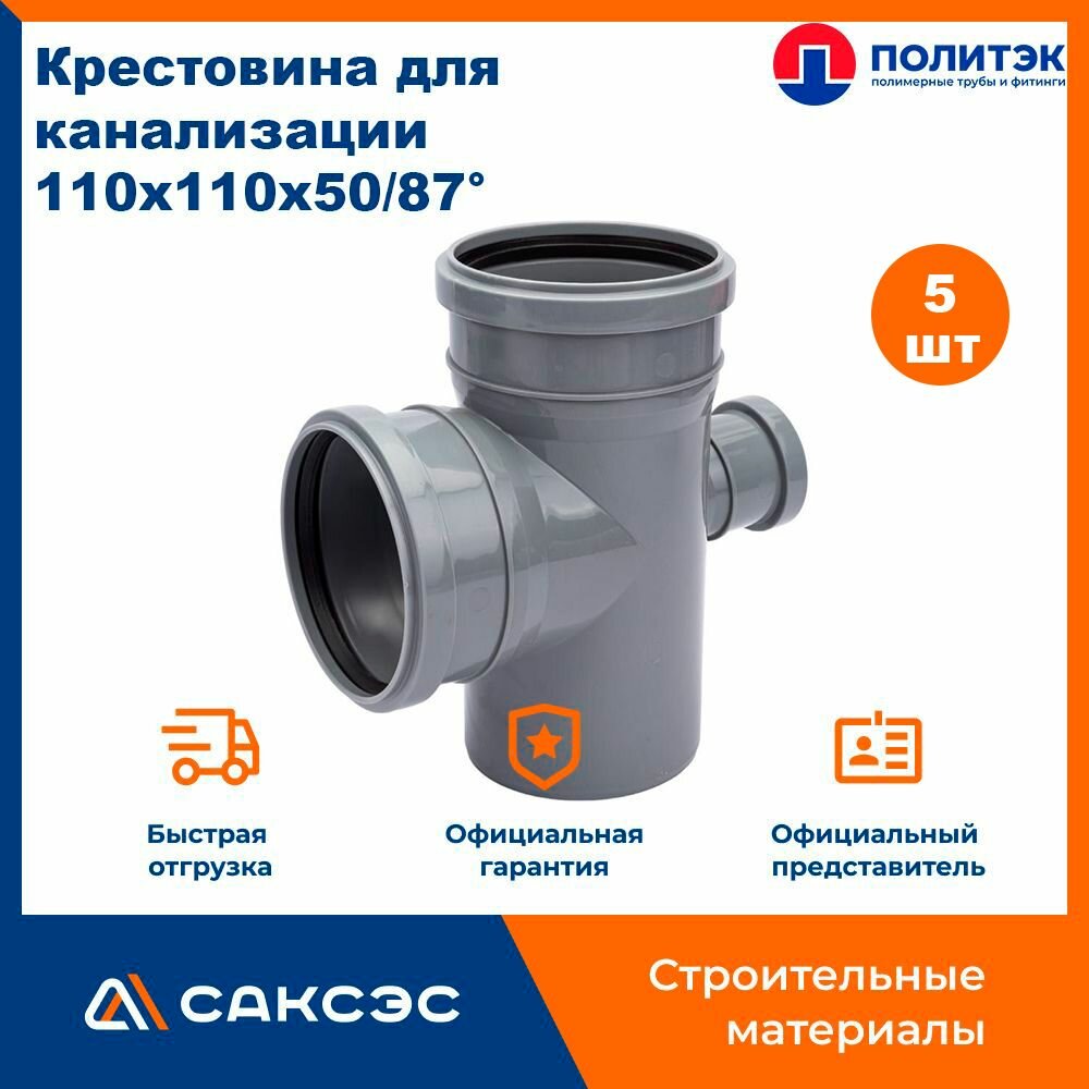 Крестовина одноплоскостная для внутренней канализации 110x110x50/87 полипропиленовая, Политэк, 5шт. / Крестовина канализационная 110 110 50 информация: