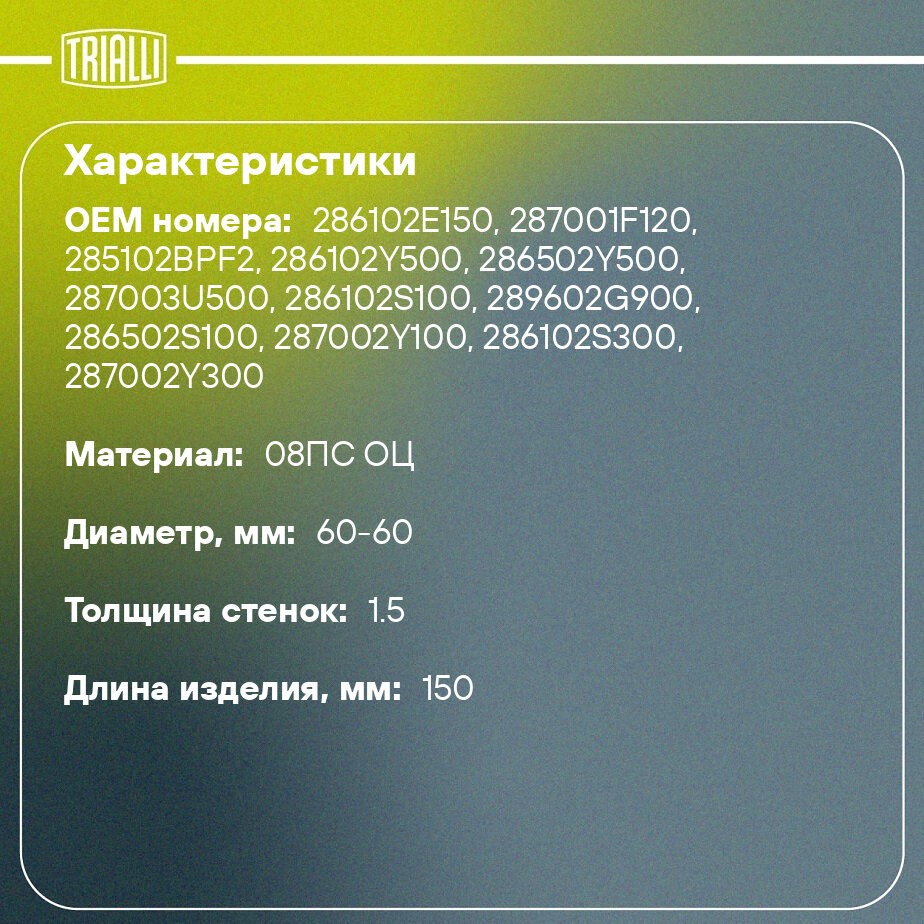 Отзывы на Соединитель труб глушителя под хомут d=60/d=60 L=150 (алюминизированная сталь) EMP 6060 TRIALLI