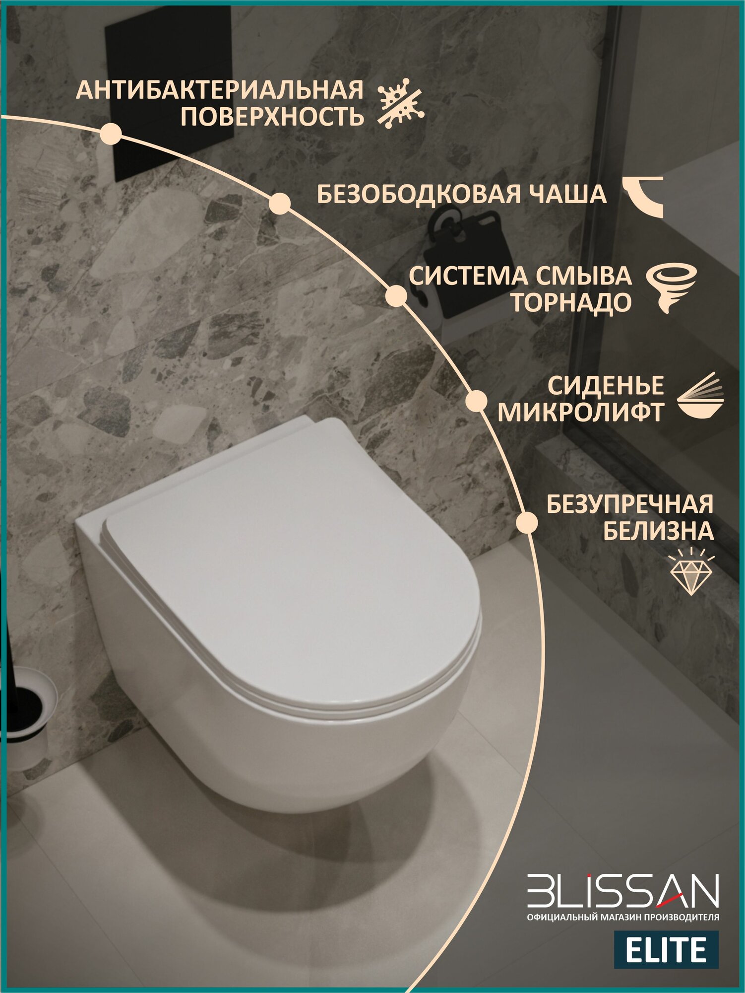 Отзывы на Унитаз подвесной безободковый Elite BLISSAN смыв Торнадо 3.0 с сиденьем микролифт быстросъемное