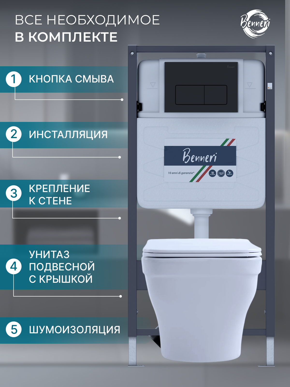 10 цен на Комплект Инсталляция Benneri+унитаз подвесной Амадео безободковый, с микролифтом+кнопка смыва Benneri Luna черная
