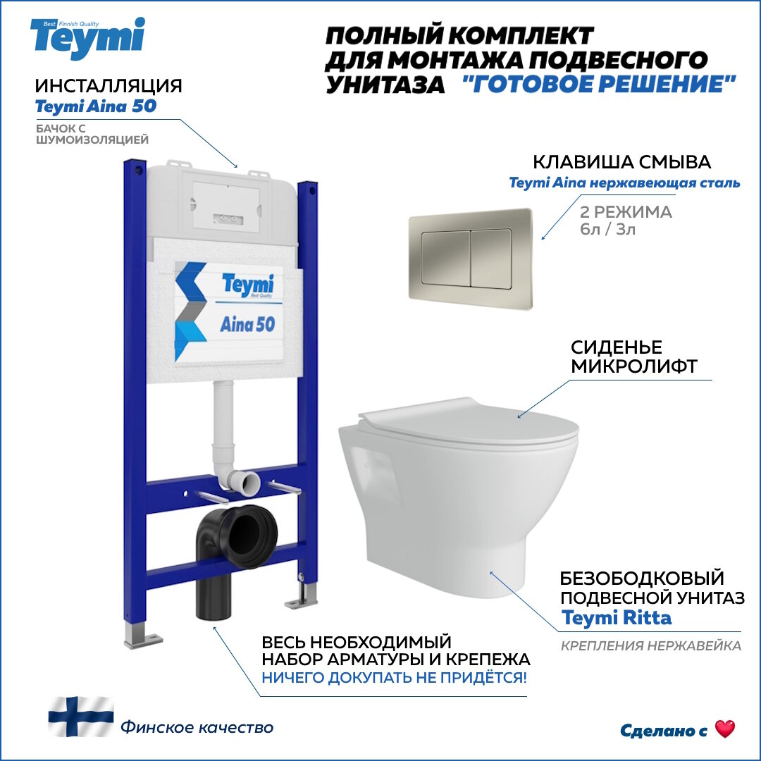 Инсталляция с унитазом комплект 5 в 1 Teymi унитаз подвесной безободковый Ritta кнопка нержавеющая сталь F13510 информация:
