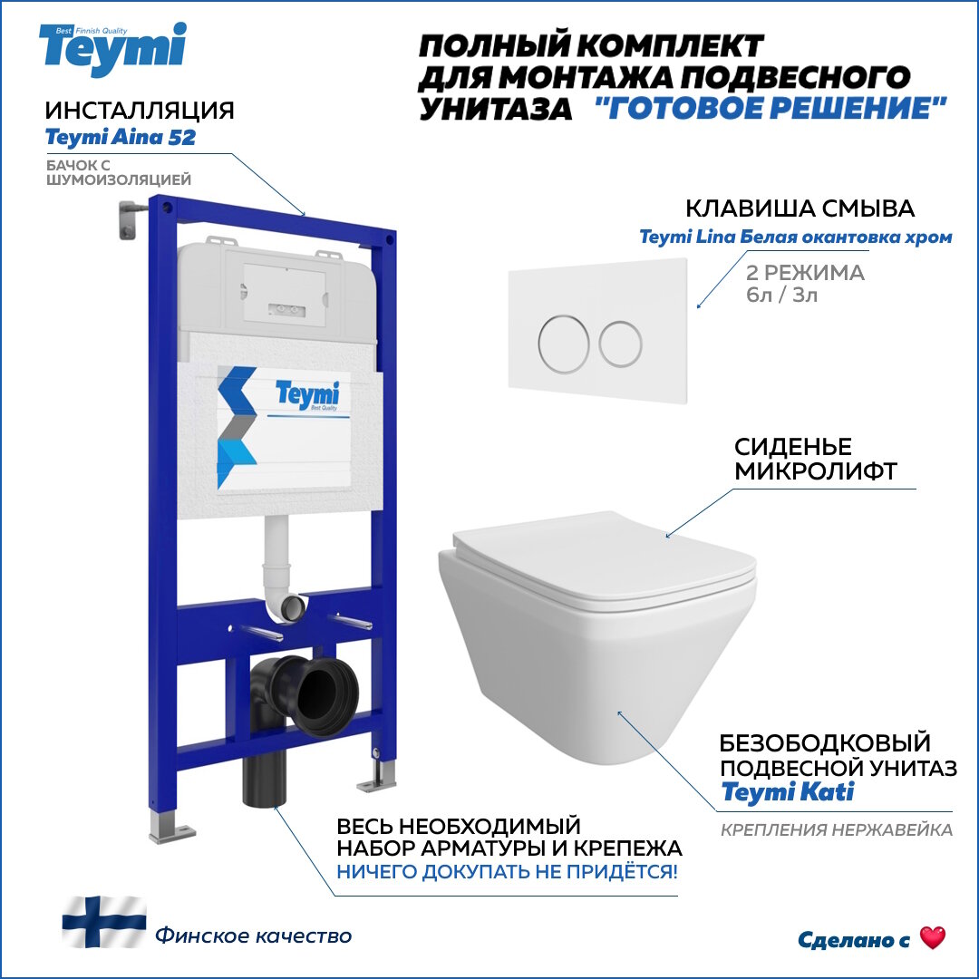 10 цен на Инсталляция с унитазом комплект 5 в 1 Teymi унитаз подвесной безободковый Kati кнопка белая / хром F13334