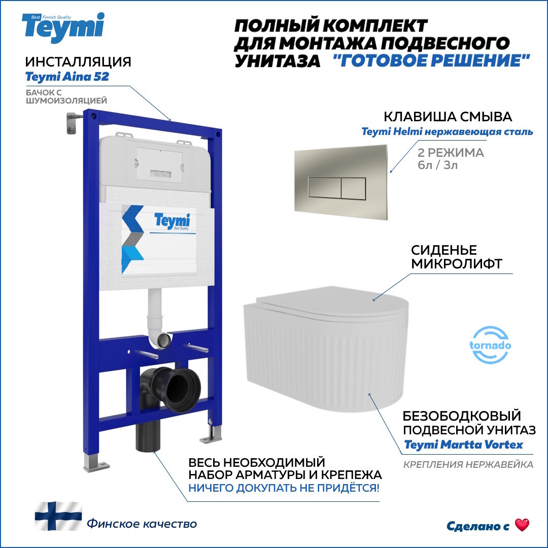 Инсталляция с унитазом комплект 5 в 1 Teymi унитаз подвесной безободковый торнадо Martta Vortex кнопка нержавеющая сталь F14517 информация: