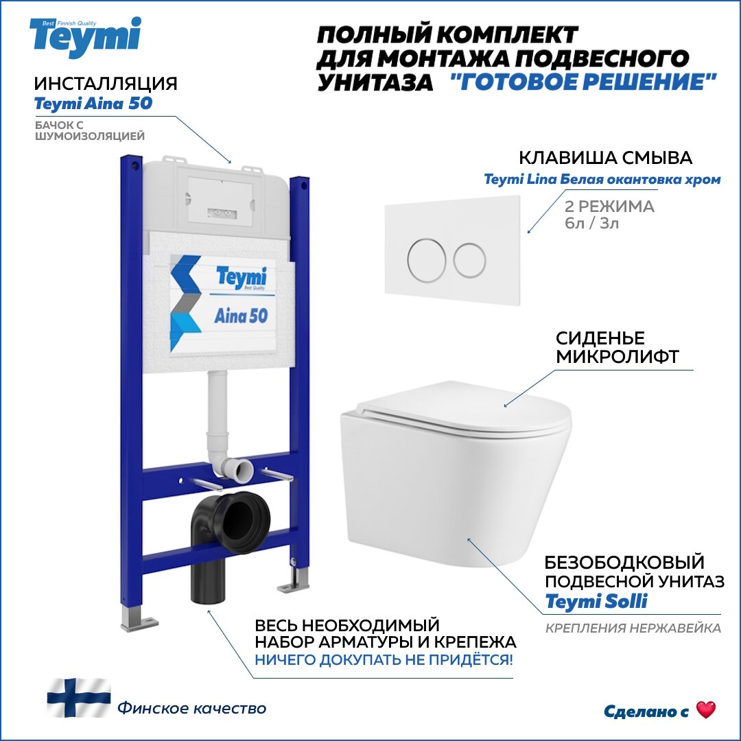 10 цен на Инсталляция с унитазом комплект 5 в 1 Teymi унитаз подвесной безободковый Solli кнопка белая / хром F13411