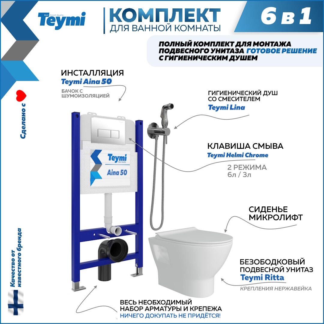Инсталляция с унитазом комплект 6 в 1 Teymi унитаз подвесной безободковый Ritta кнопка хром гигиенический душ хром F08465 информация: