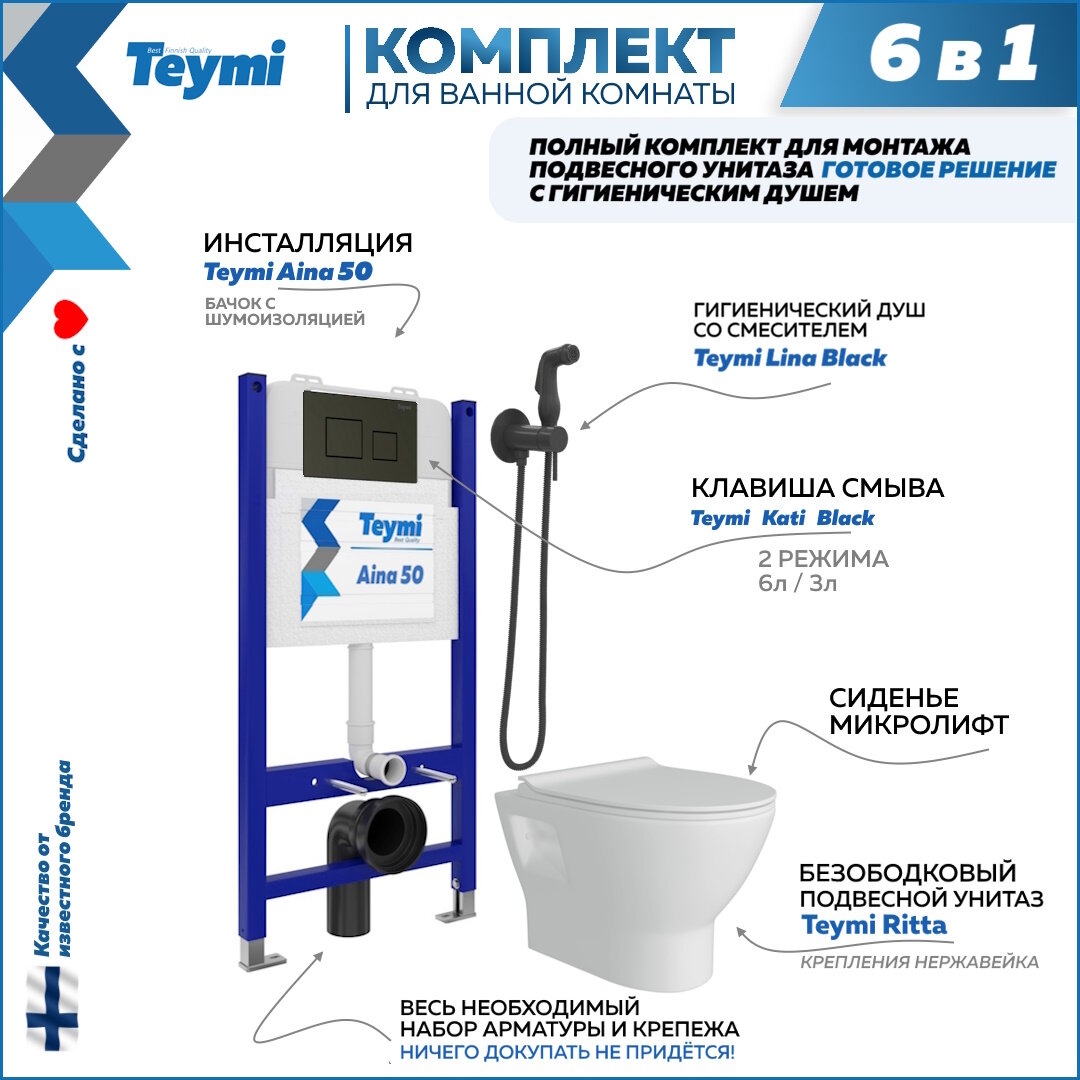 Инсталляция с унитазом комплект 6 в 1 Teymi унитаз подвесной безободковый Ritta кнопка черная гигиенический душ черный F08478 информация: