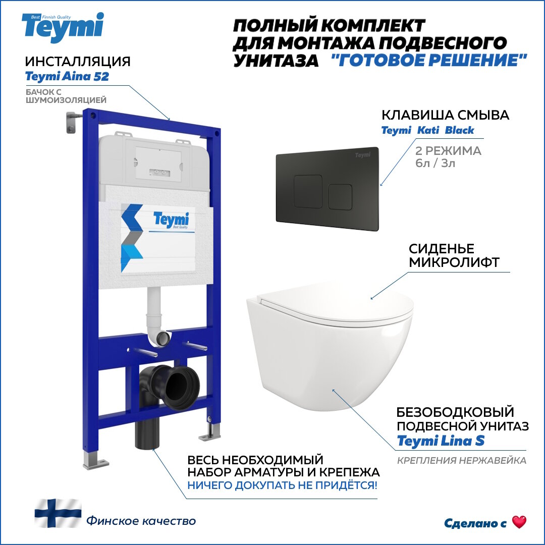 Инсталляция с унитазом комплект 5 в 1 Teymi унитаз подвесной безободковый Lina S кнопка черная T70724 информация: