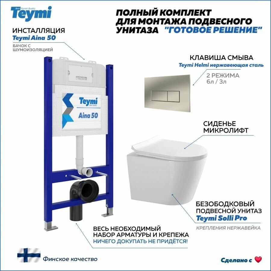 Инсталляция с унитазом комплект 5 в 1 Teymi унитаз подвесной безободковый Solli Pro кнопка нержавеющая сталь F15746 информация: