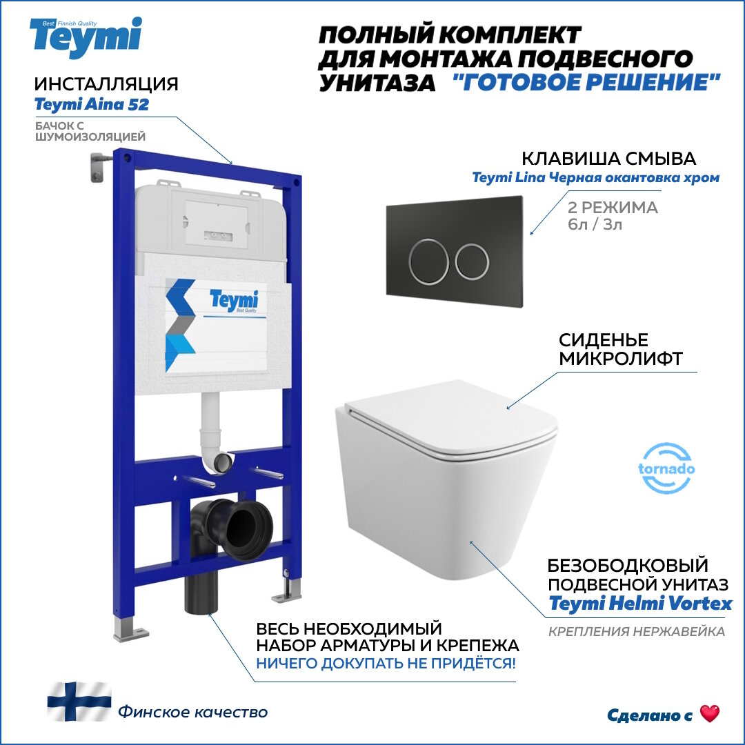 Инсталляция с унитазом комплект 5 в 1 Teymi унитаз подвесной безободковый торнадо Helmi Vortex кнопка черная / хром F13305 информация: