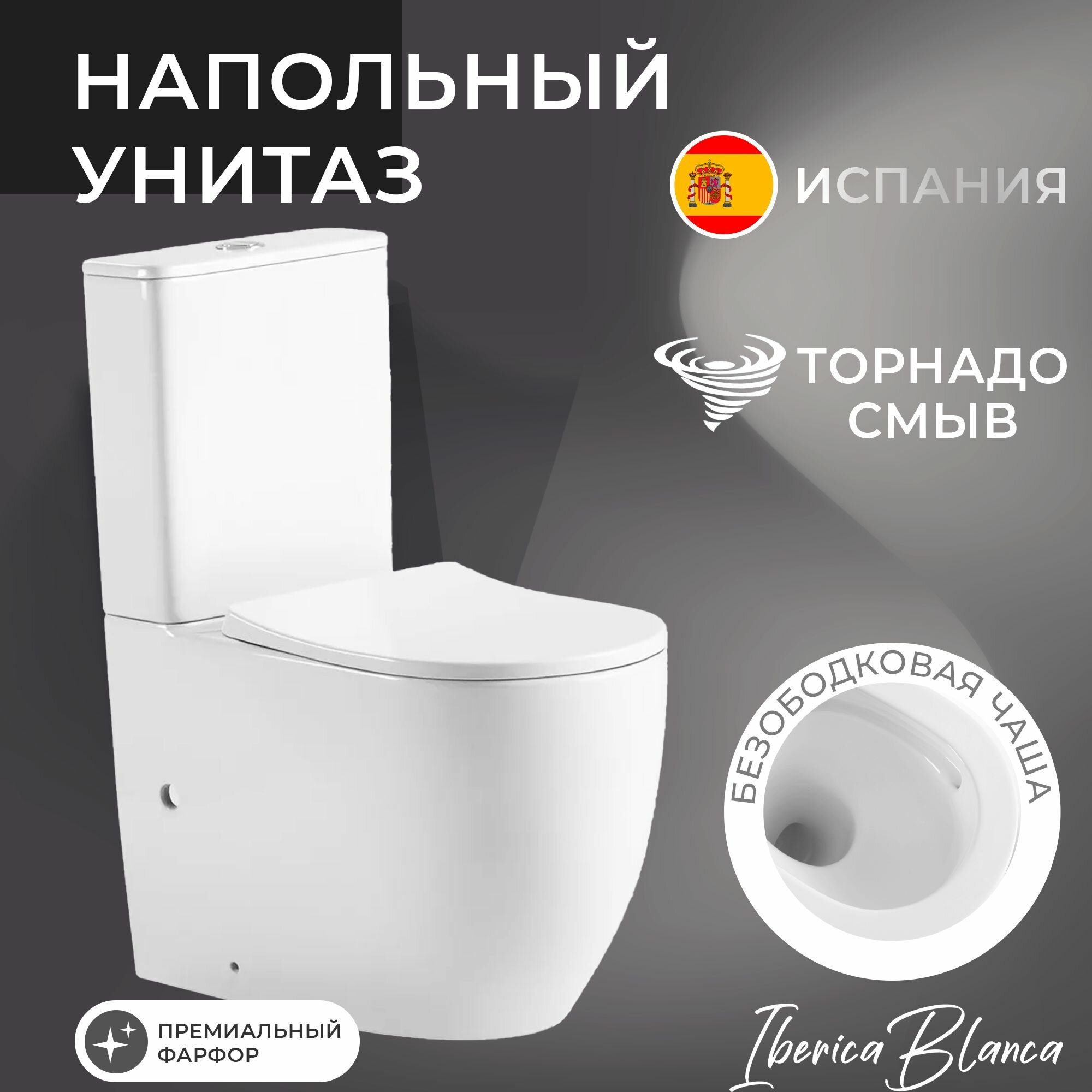 Напольный Унитаз белый, безободковый TORNADO, BILBAO MAXI тонкое сиденье дюропласт, soft close IBERICA BLANCA информация: