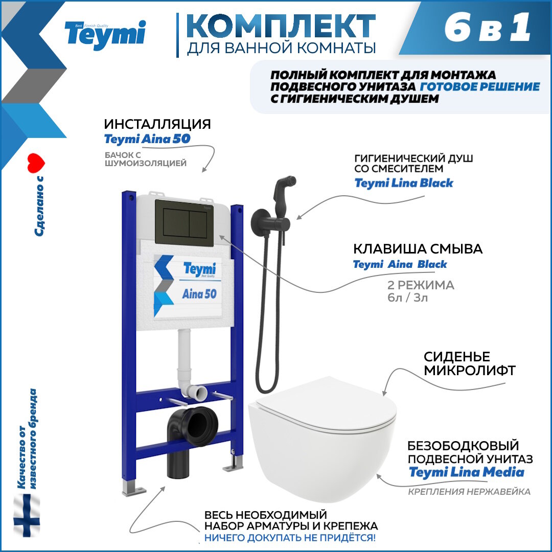 Инсталляция с унитазом комплект 6 в 1 Teymi унитаз подвесной безободковый Lina Media кнопка черная гигиенический душ черный F08357 информация: