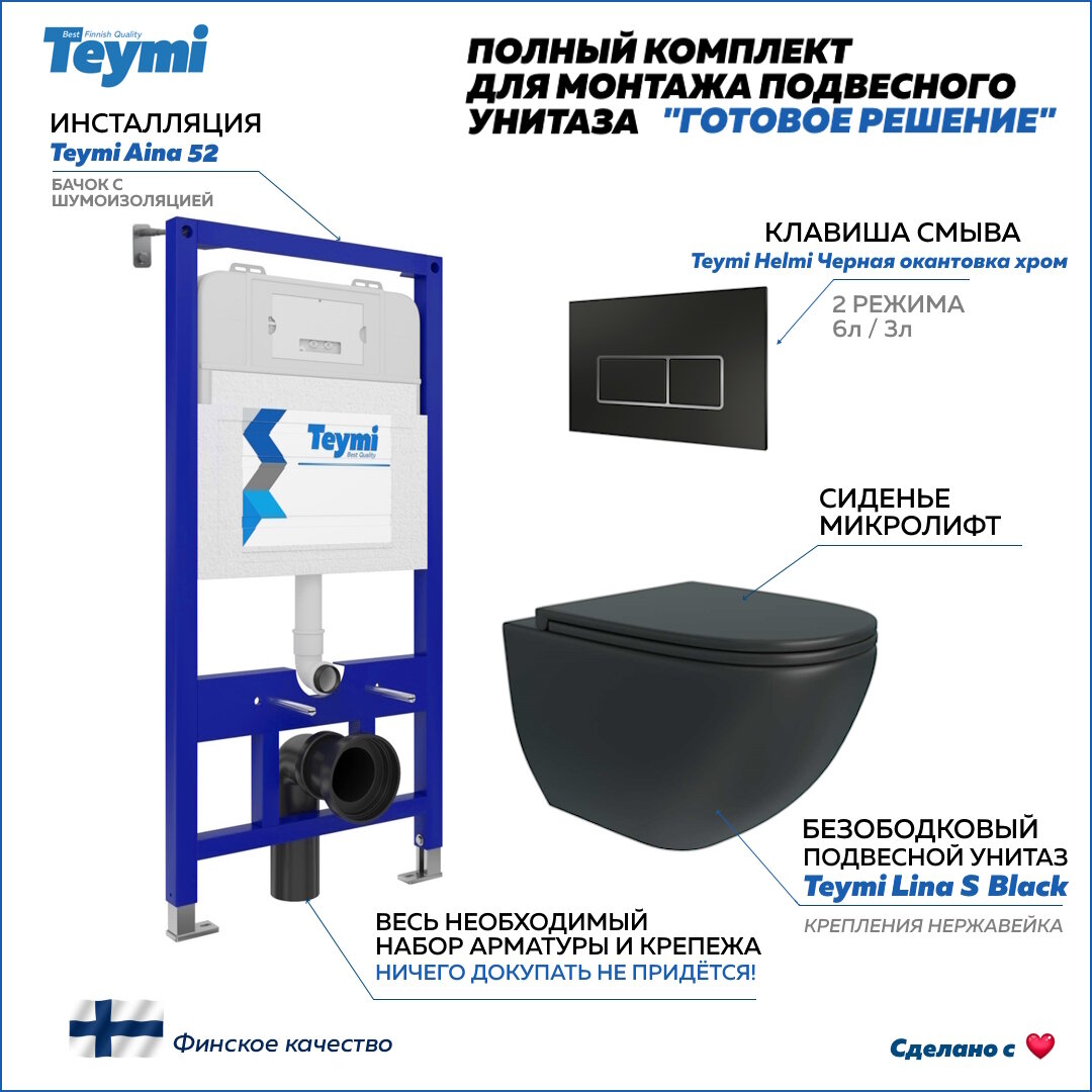 Инсталляция с унитазом комплект 5 в 1 Teymi унитаз подвесной безободковый черный Lina S Black кнопка черная / хром F13393 информация: