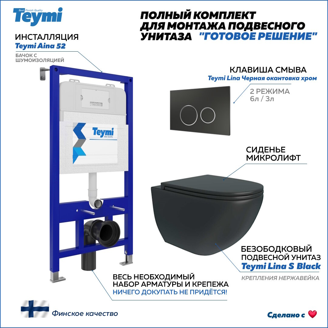 Отзывы на Инсталляция с унитазом комплект 5 в 1 Teymi унитаз подвесной безободковый черный Lina S Black кнопка черная / хром F13396