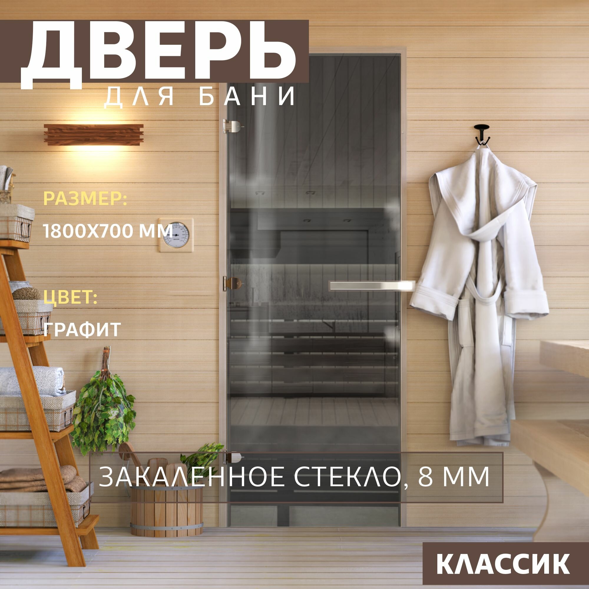 Дверь для бани "Графит". 1800х700 мм по коробке. Левая (петли слева) информация: