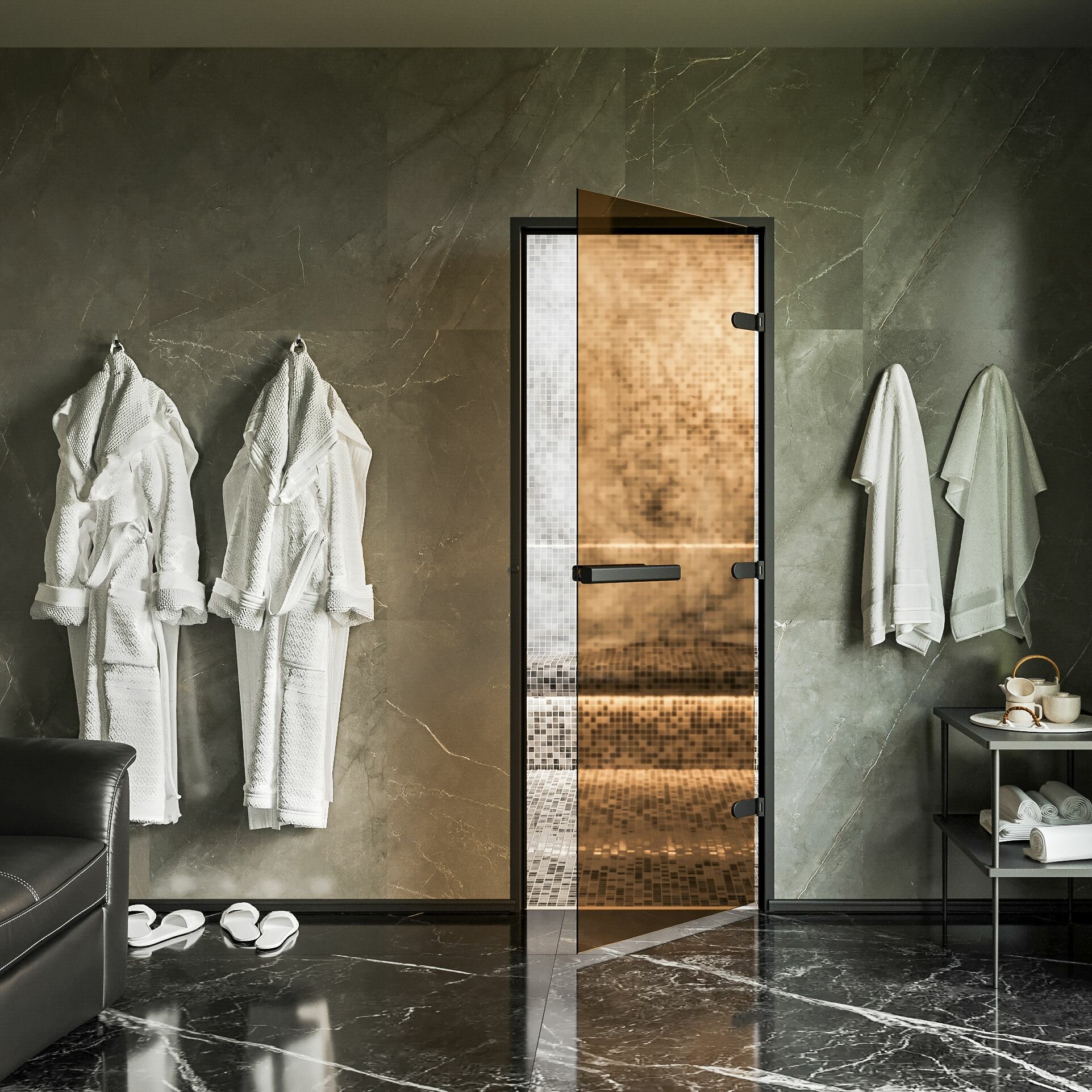 Отзывы на Дверь для хамам и сауны Gratec Estri BK Premium, чёрные короб и фурнитура, бронза прозрачное закаленное стекло 8 мм, правое открывание