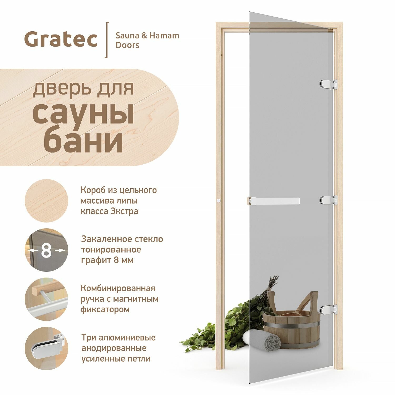 Дверь для бани и сауны Gratec Kati, короб из массива липы, серое прозрачное закаленное стекло 8 мм, правое открывание информация: