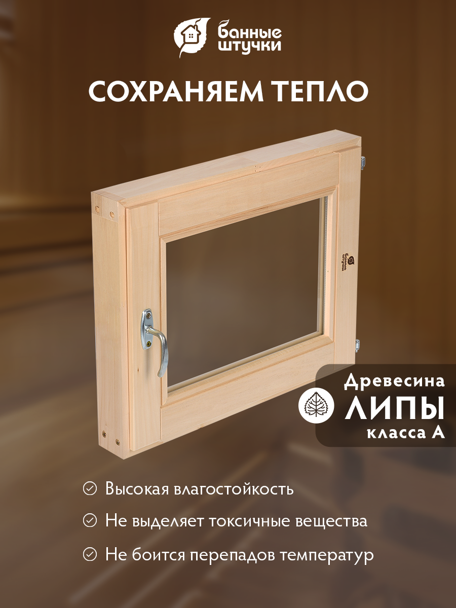 Форточка в парную, стеклопакет, 0,4х0,5 м, с ручкой, затвором, петлями, липа Класс Б "Банные штучки" информация: