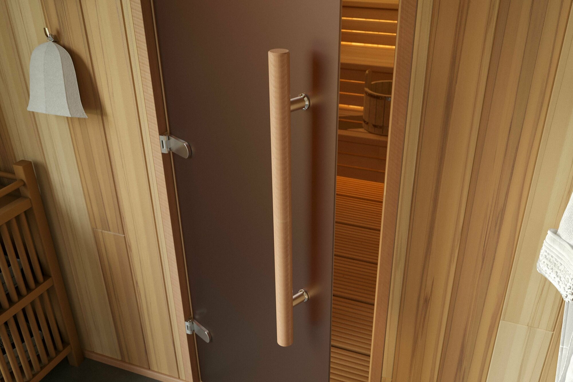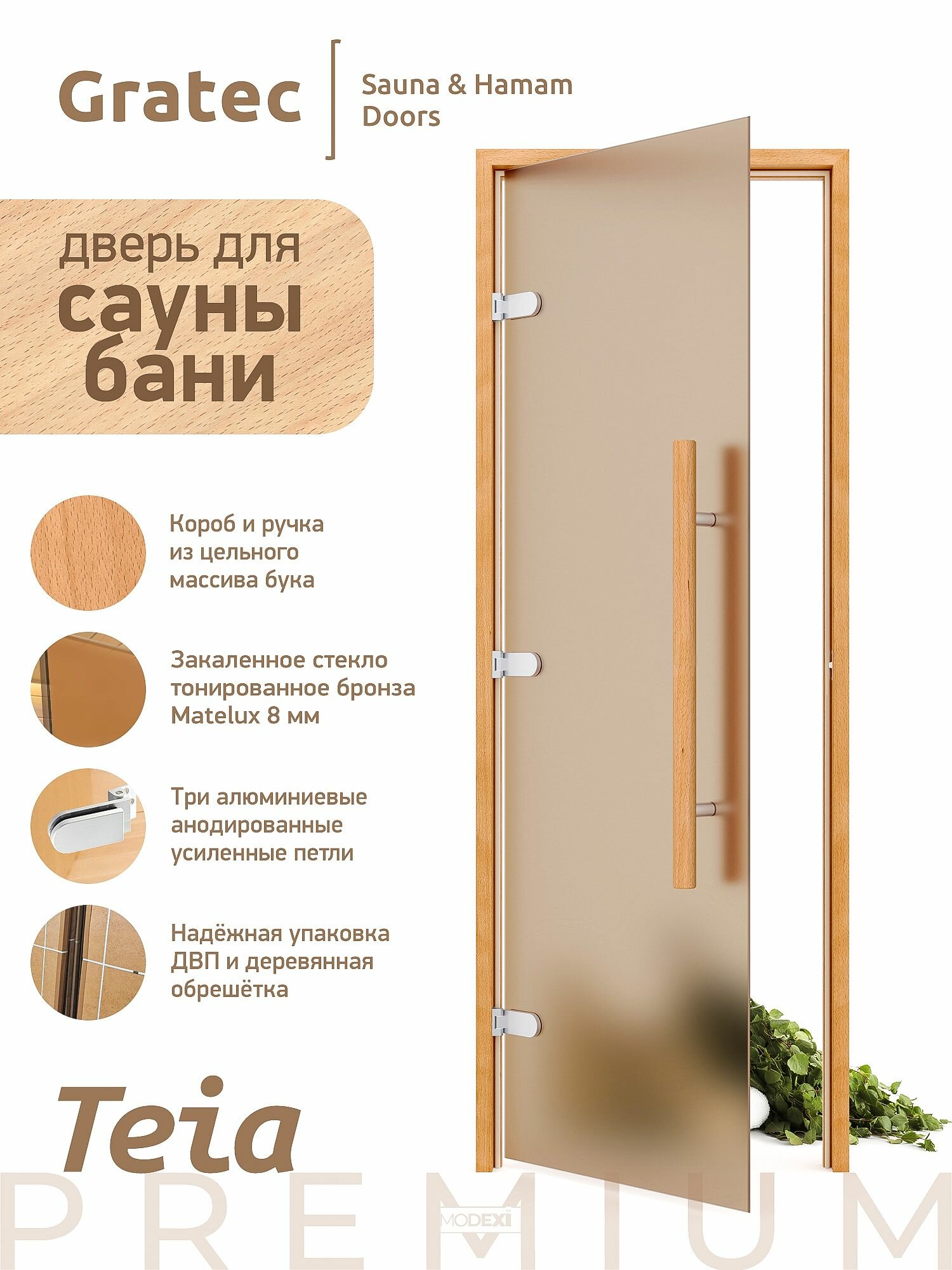 Дверь для бани и сауны Gratec Teia Premium 2025, короб из массива бука, бронза матовое закаленное стекло 8 мм, левое открывание информация: