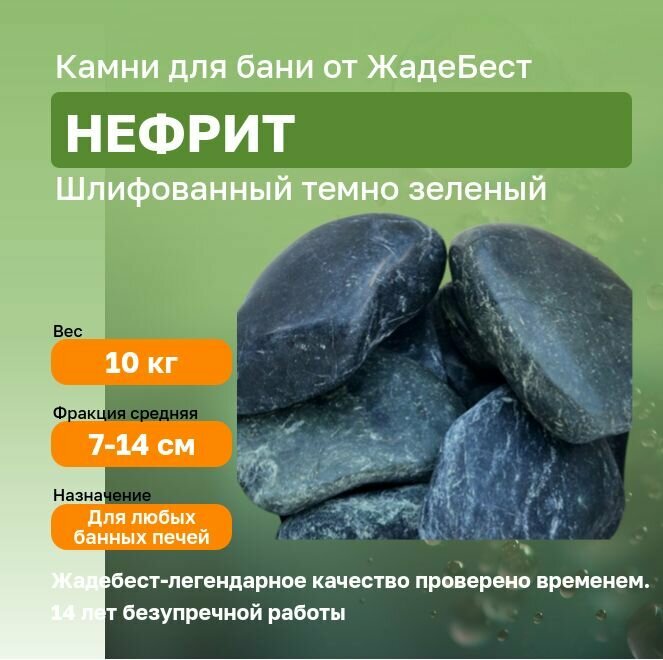 Нефрит шлифованный (темно-зелёный) ЖадеБест средняя фракция 7-14 см для бани и сауны 10 кг информация: