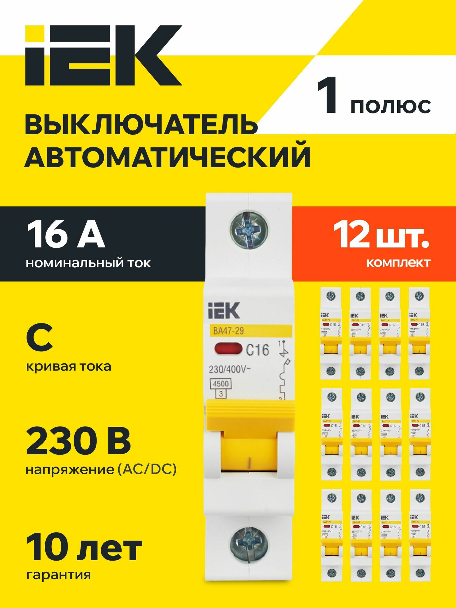 Автоматический выключатель 12 шт, IEK, ВА47-29, 1P, 16A, 4.5кА, IP20, KARAT информация: