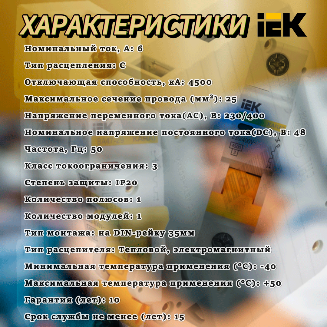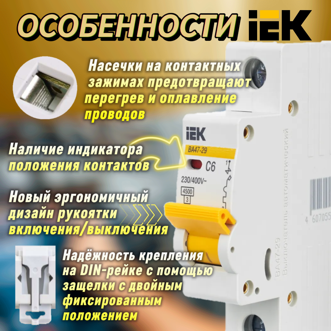 Отзывы на Автоматический выключатель 1Р 6А (С) ВА47-29 4.5кА IEK MVA20-1-006-C