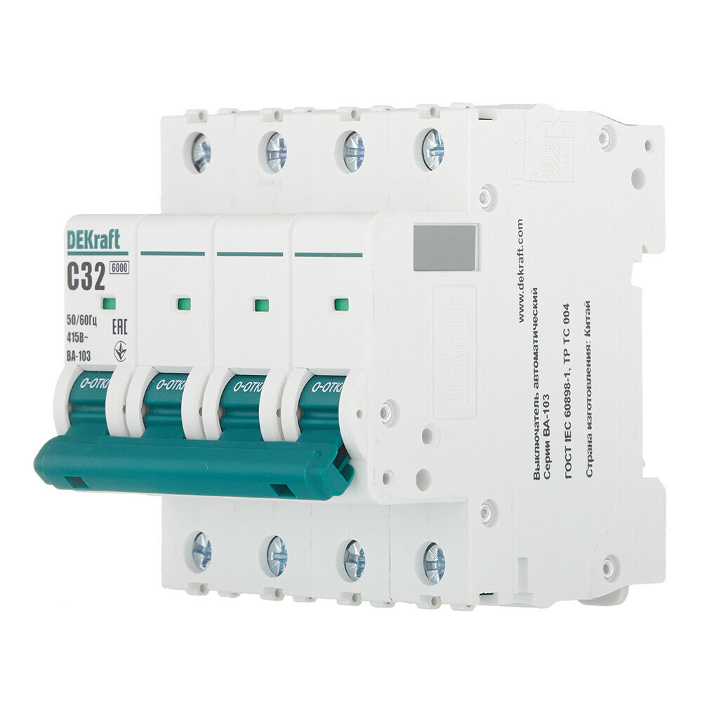 10 цен на Автоматический выключатель DEKraft четырехполюсный 32А х-ка C ВА-103 6кА 12324DEK