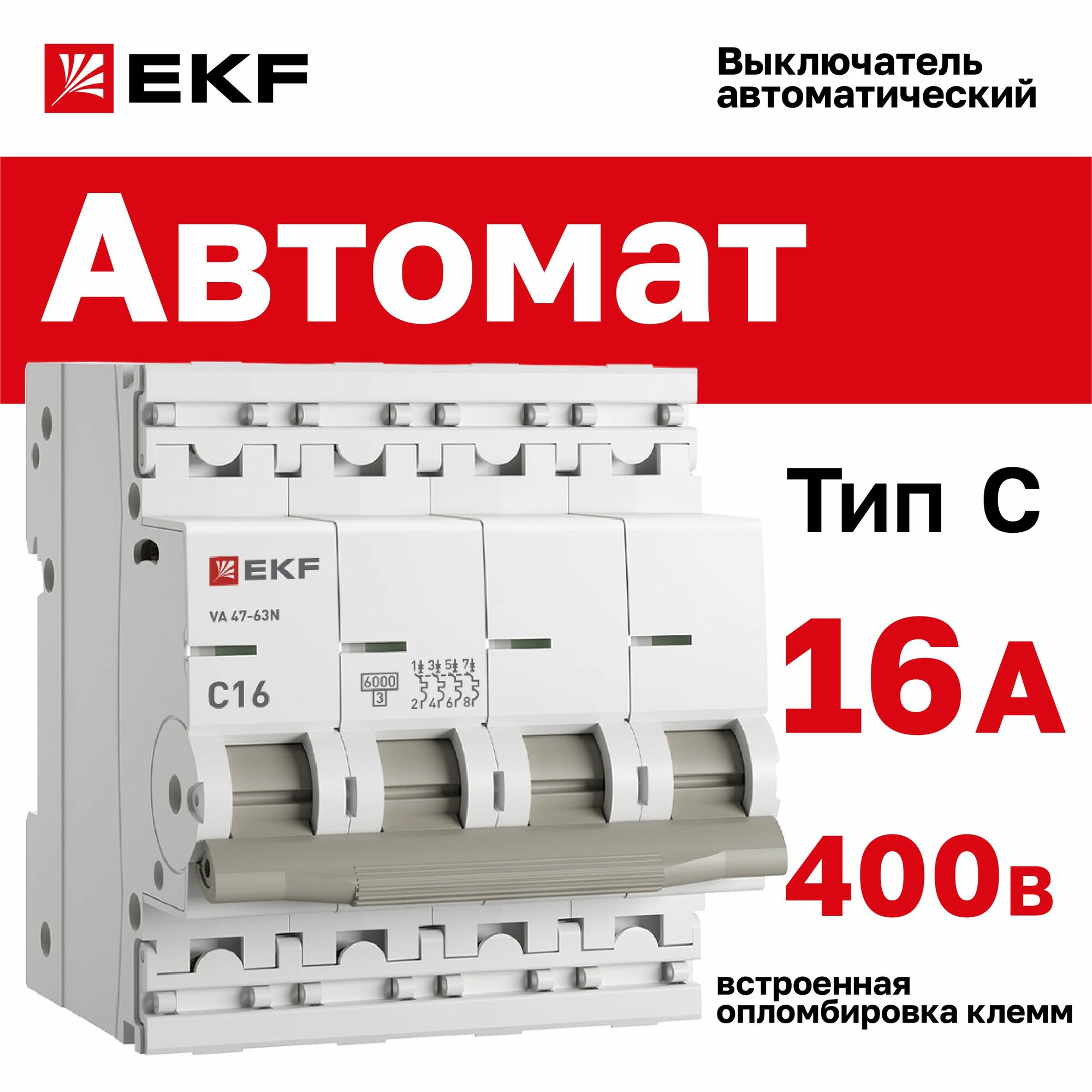 Автомат 16А, тип C, четырехполючный 4P, 6кА, cо встроенной опломбировкой клемм EKF PROxima ВА 47-63N (Автоматический выключатель C16) информация: