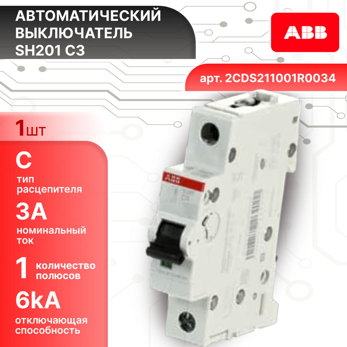 Автоматический выключатель 1P (1П) 3А тип C 6кА SH201 ABB 2CDS211001R0034 1шт информация: