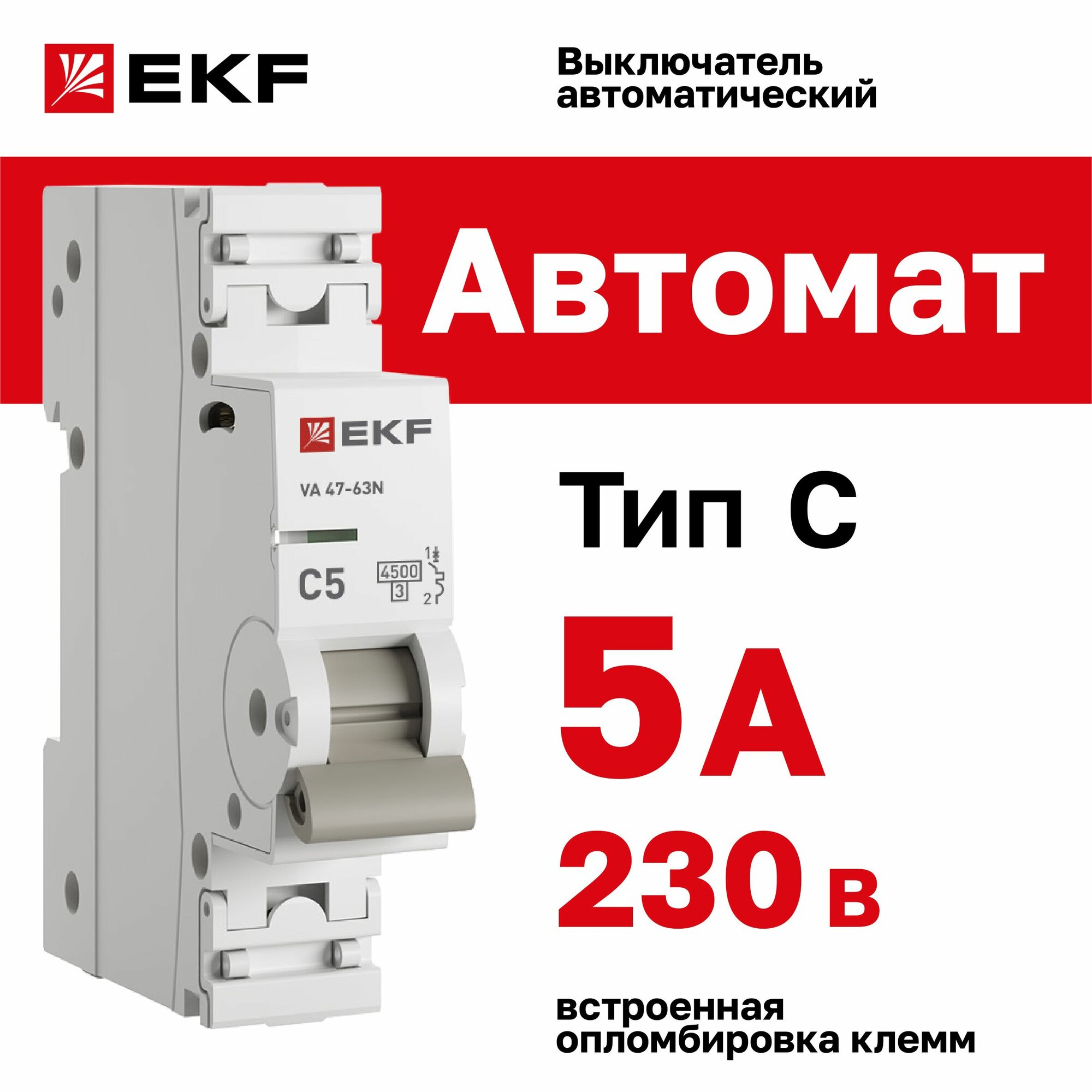 Автомат 5А, тип C, однополюсный 1P, 4,5kA, cо встроенной опломбировкой клемм EKF PROXIMA ВА 47-63N (Автоматический выключатель C5) информация: