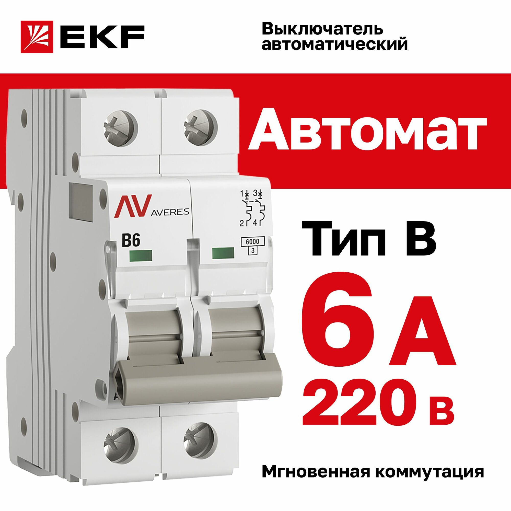 10 цен на Автомат 6A, тип B, двухполюсный 2P, 6kA, EKF AVERES (Автоматический выключатель B6)