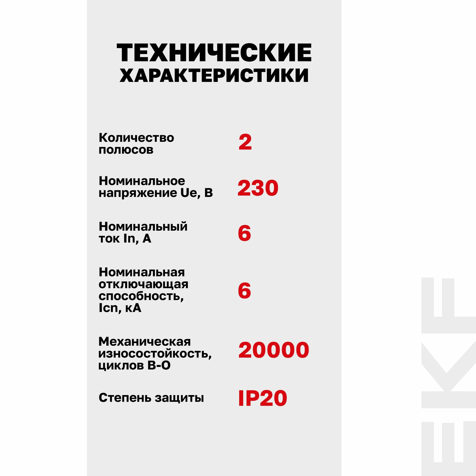 Автомат 6A, тип B, двухполюсный 2P, 6kA, EKF AVERES (Автоматический выключатель B6) информация:
