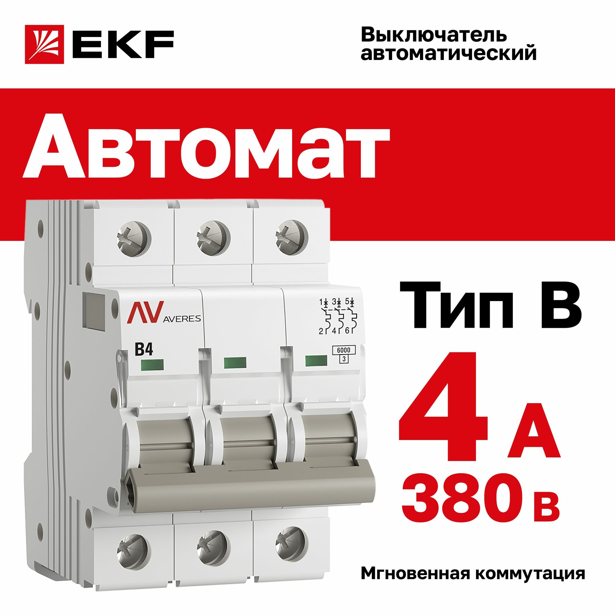 Автомат 4A, тип B, трёхполюсный 3P, 6kA, EKF AVERES (Автоматический выключатель B4) информация: