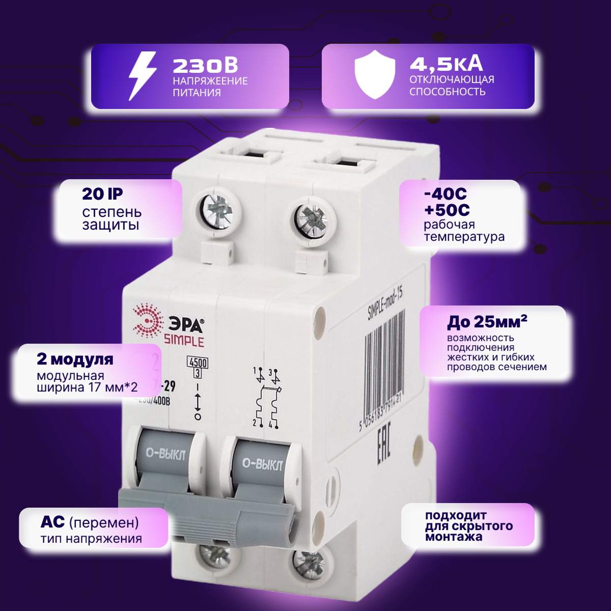 Автоматический выключатель 2P (2П) 6А (C) 4,5кА ВА 47-29 SIMPLE-mod-10 ЭРА Б0039227 2шт информация: