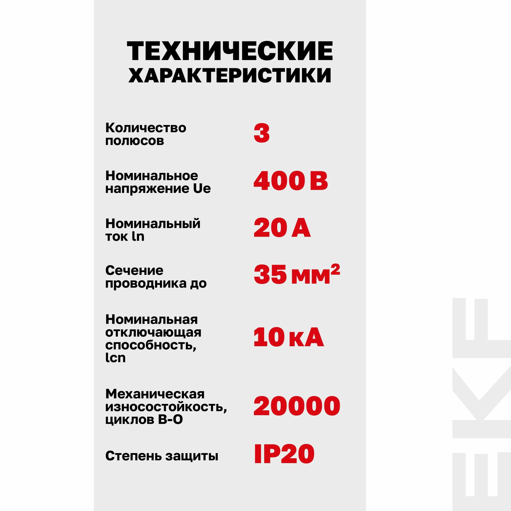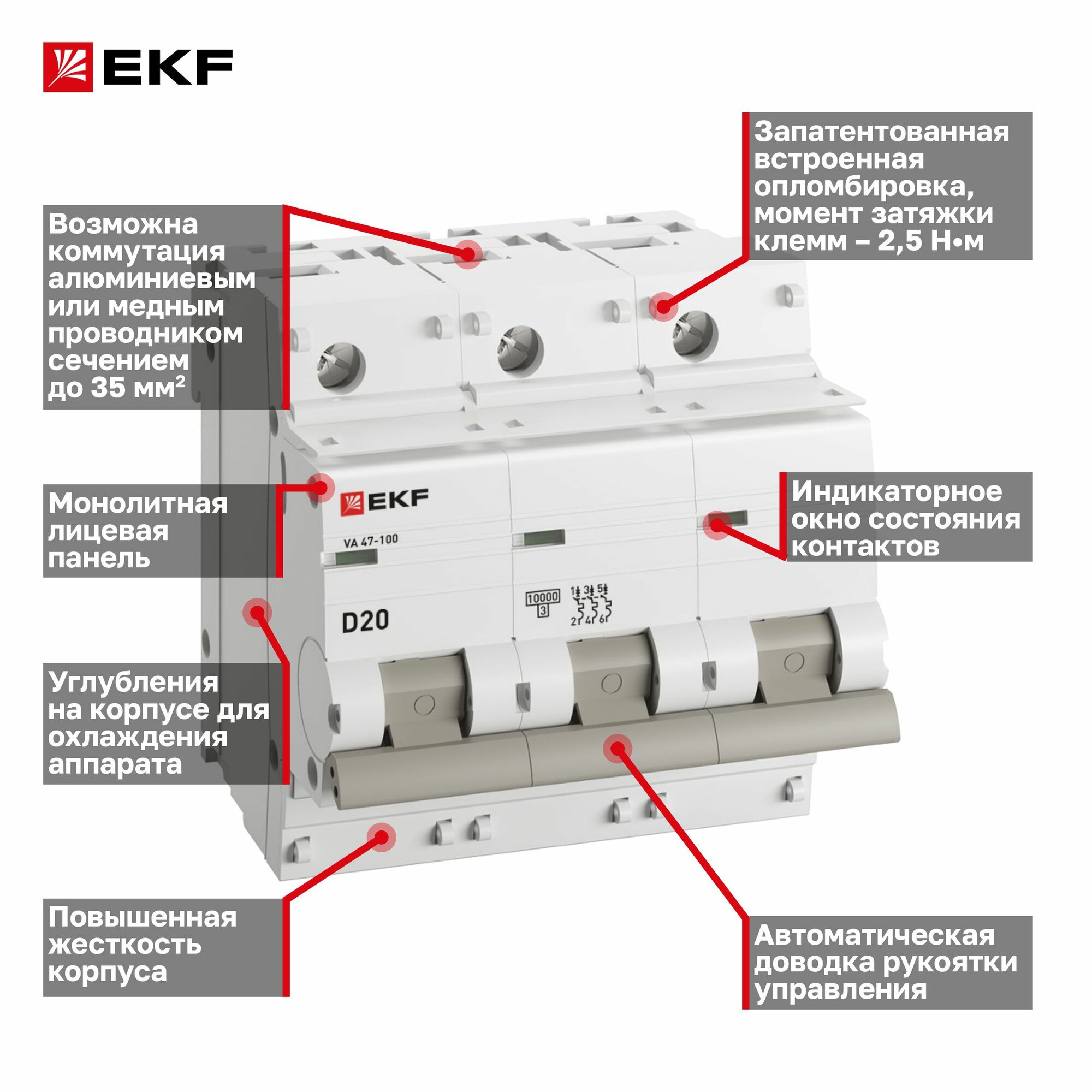 Автомат 20А, тип D, трехполюсный 3P, 10kA, cо встроенной опломбировкой клемм EKF PROxima ВА 47-100 (Автоматический выключатель D20) информация: